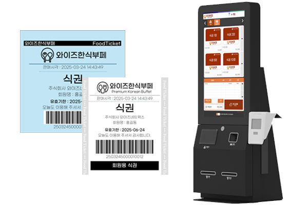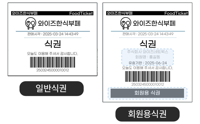 와이즈 식권키오스크의 식권양식 하단에 회원용 / 비회원용 문구 인쇄가 가능하며,