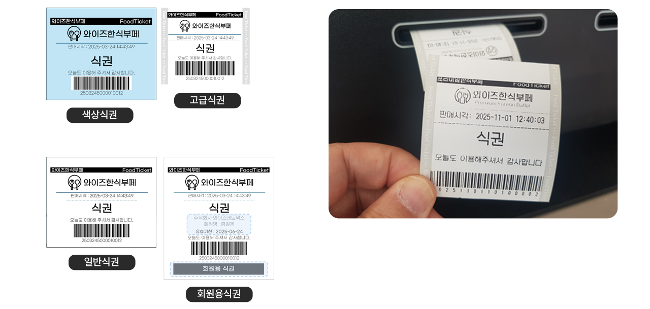 부정식권 방지위한 매장로고 적용 / 유효기간 & 회원정보 인쇄가능 / 고급식권 or 색상식권 선택