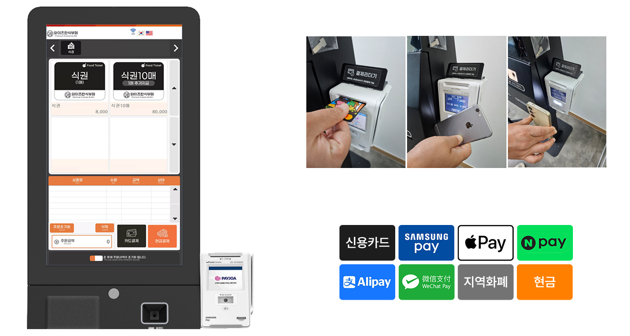 - 카드리더기 (멀티) : 신용카드, 삼성페이 및 애플페이, 네이버페이, 카카오페이 등 결제지원
